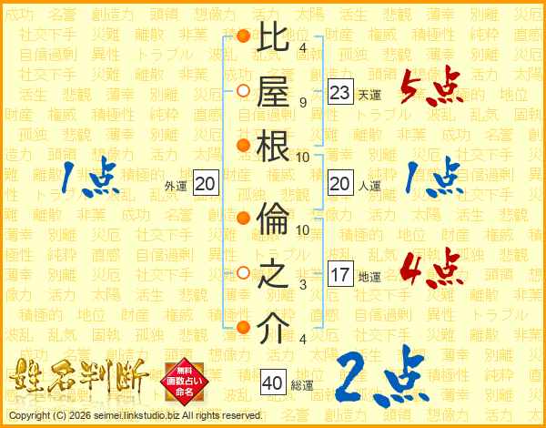 比屋根倫之介さんの天運は23画の5点!