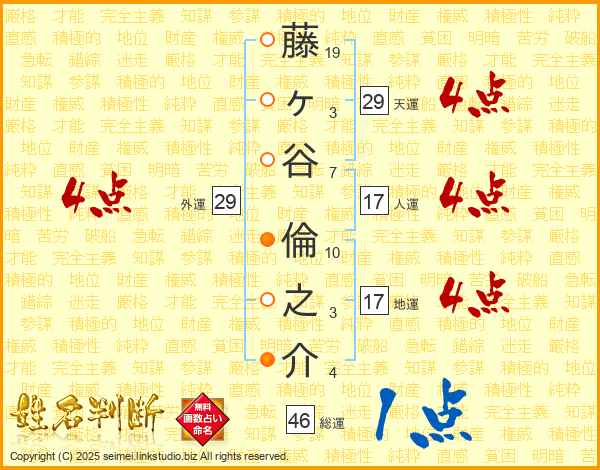 藤(19画)ヶ(3画)谷(7画) 倫(10画)之(3画)介(4画)