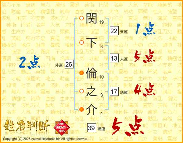 関(19画)下(3画) 倫(10画)之(3画)介(4画)