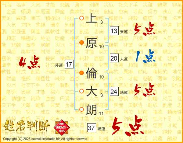 上(3画)原(10画) 倫(10画)大(3画)朗(11画)