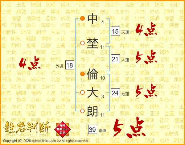 中埜倫大朗さんの人運は21画の5点!