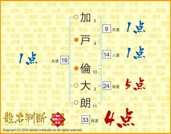 加(5画)戸(4画) 倫(10画)大(3画)朗(11画)