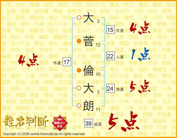 大菅倫大朗さんの総運は39画の5点!