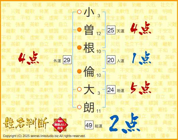 小(3画)曽(12画)根(10画) 倫(10画)大(3画)朗(11画)