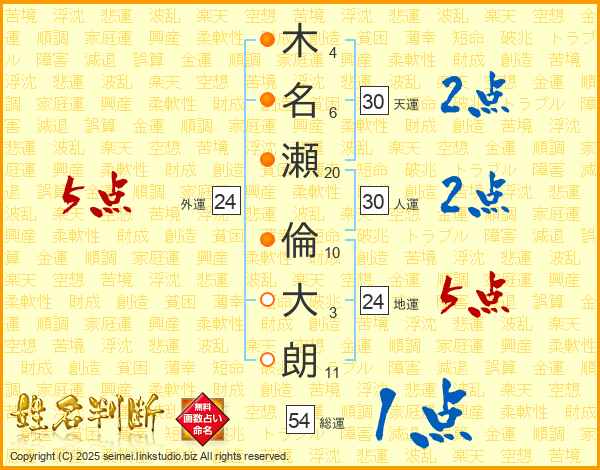 木(4画)名(6画)瀬(20画) 倫(10画)大(3画)朗(11画)