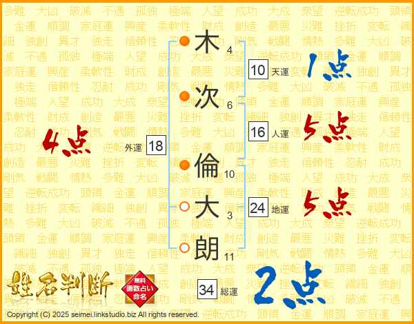 木(4画)次(6画) 倫(10画)大(3画)朗(11画)