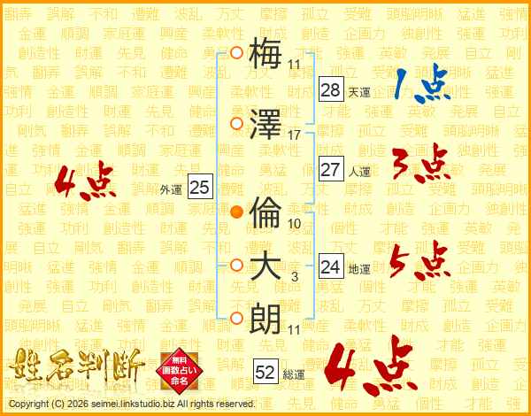 梅(11画)澤(17画) 倫(10画)大(3画)朗(11画)