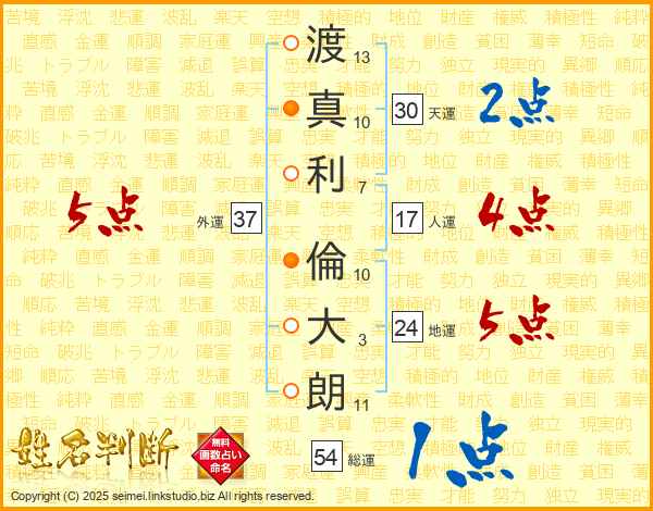 渡(13画)真(10画)利(7画) 倫(10画)大(3画)朗(11画)
