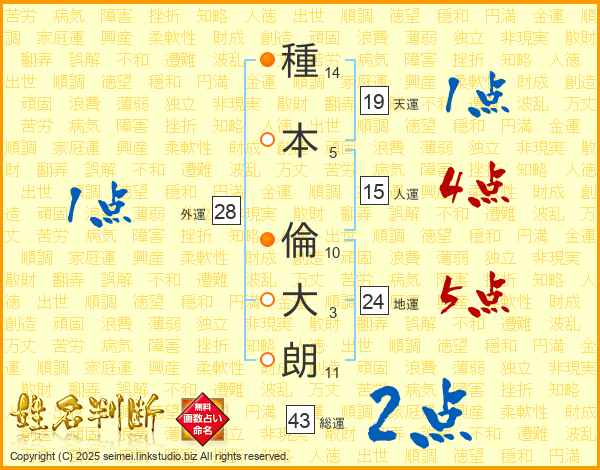 種本倫大朗さんの地運は24画の5点!