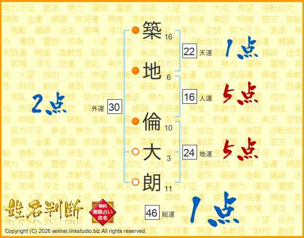 築(16画)地(6画) 倫(10画)大(3画)朗(11画)