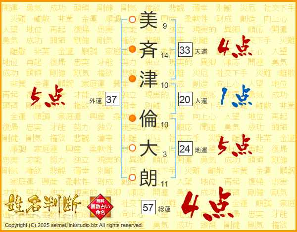 美(9画)斉(14画)津(10画) 倫(10画)大(3画)朗(11画)