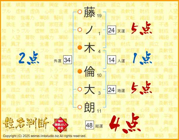 藤(19画)ノ(1画)木(4画) 倫(10画)大(3画)朗(11画)