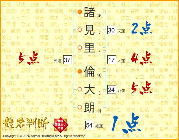 諸(16画)見(7画)里(7画) 倫(10画)大(3画)朗(11画)