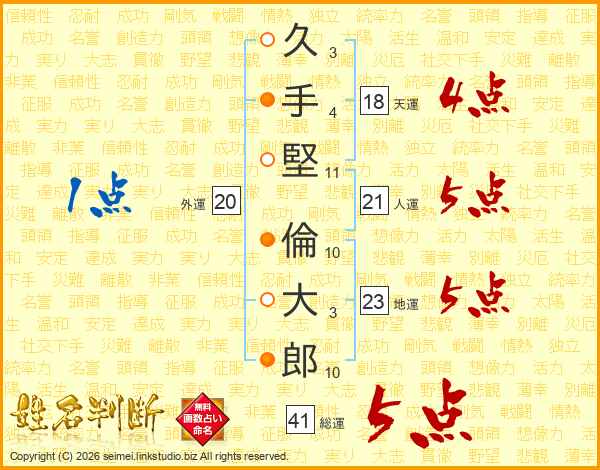 久(3画)手(4画)堅(11画) 倫(10画)大(3画)郎(10画)