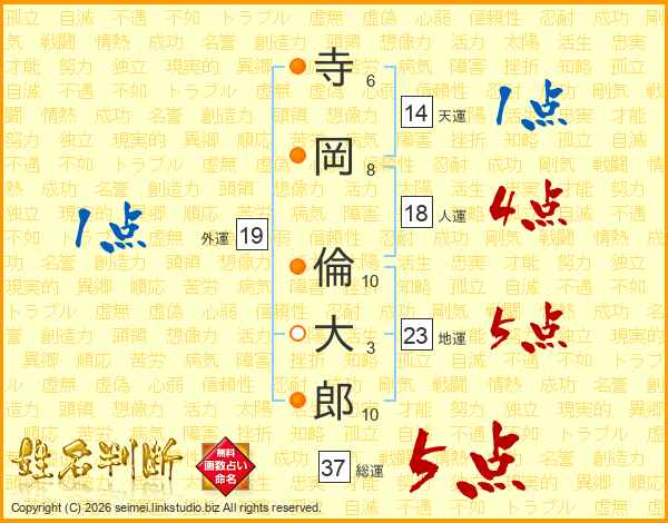 寺(6画)岡(8画) 倫(10画)大(3画)郎(10画)