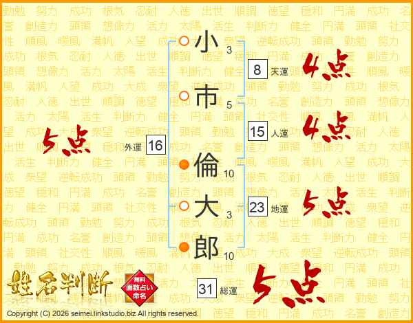 小(3画)市(5画) 倫(10画)大(3画)郎(10画)
