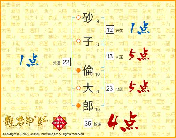 砂(9画)子(3画) 倫(10画)大(3画)郎(10画)