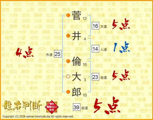 菅井倫大郎さんの総運は39画の5点!