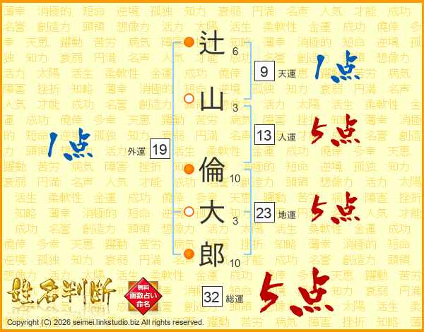 辻(6画)山(3画) 倫(10画)大(3画)郎(10画)