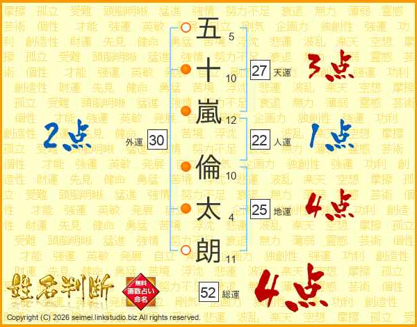 五(5画)十(10画)嵐(12画) 倫(10画)太(4画)朗(11画)