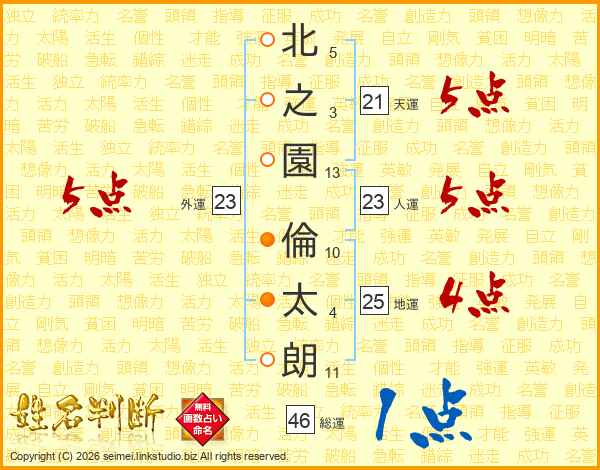 北(5画)之(3画)園(13画) 倫(10画)太(4画)朗(11画)