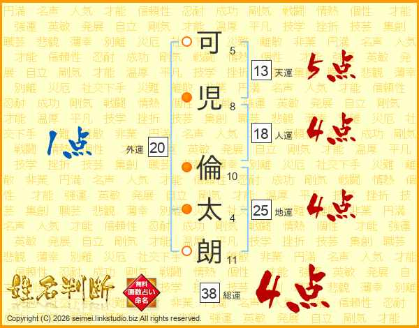 可(5画)児(8画) 倫(10画)太(4画)朗(11画)
