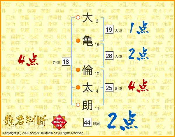 大(3画)亀(16画) 倫(10画)太(4画)朗(11画)
