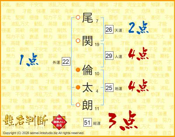 尾(7画)関(19画) 倫(10画)太(4画)朗(11画)