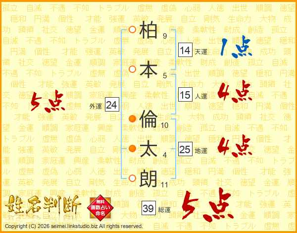 柏(9画)本(5画) 倫(10画)太(4画)朗(11画)