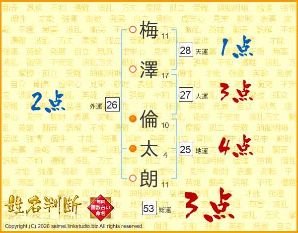 梅(11画)澤(17画) 倫(10画)太(4画)朗(11画)
