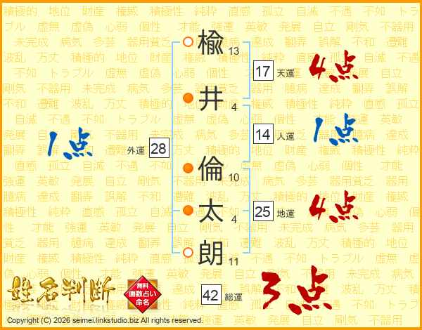 楡(13画)井(4画) 倫(10画)太(4画)朗(11画)
