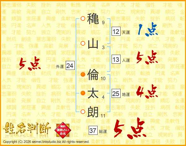 穐(9画)山(3画) 倫(10画)太(4画)朗(11画)