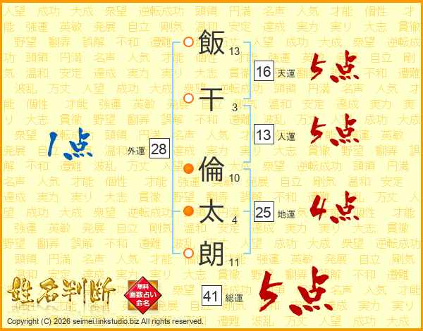 飯(13画)干(3画) 倫(10画)太(4画)朗(11画)