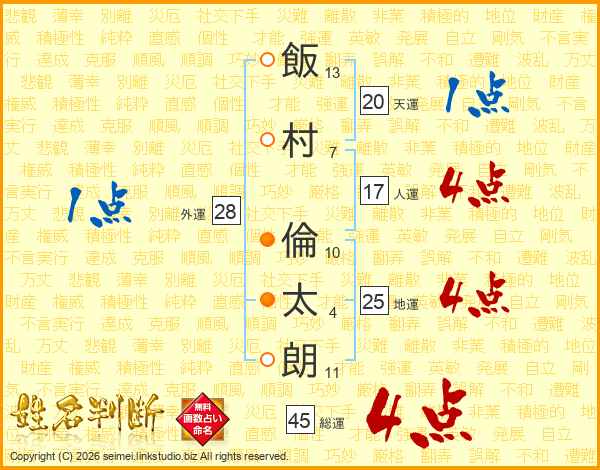 飯(13画)村(7画) 倫(10画)太(4画)朗(11画)