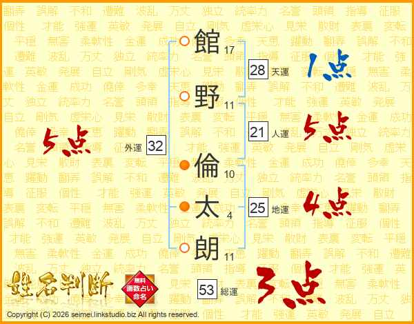 館(17画)野(11画) 倫(10画)太(4画)朗(11画)
