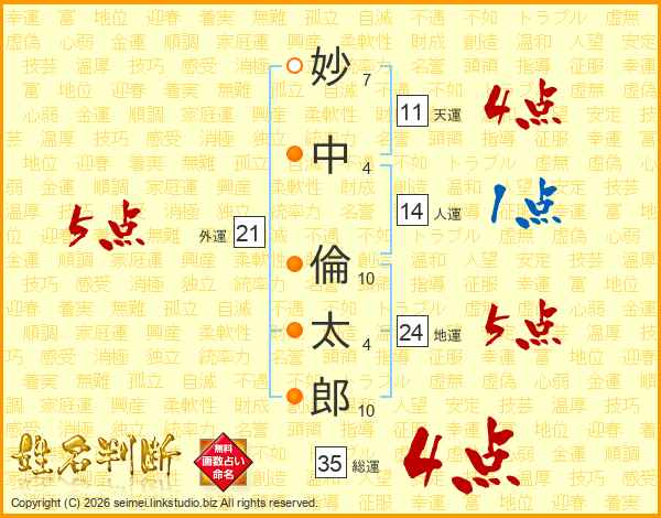 妙(7画)中(4画) 倫(10画)太(4画)郎(10画)