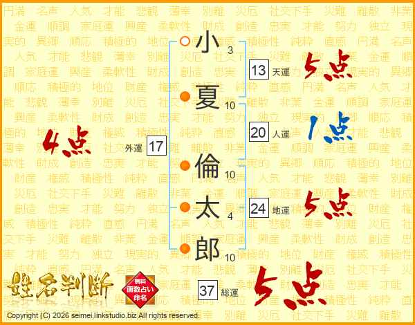 小(3画)夏(10画) 倫(10画)太(4画)郎(10画)