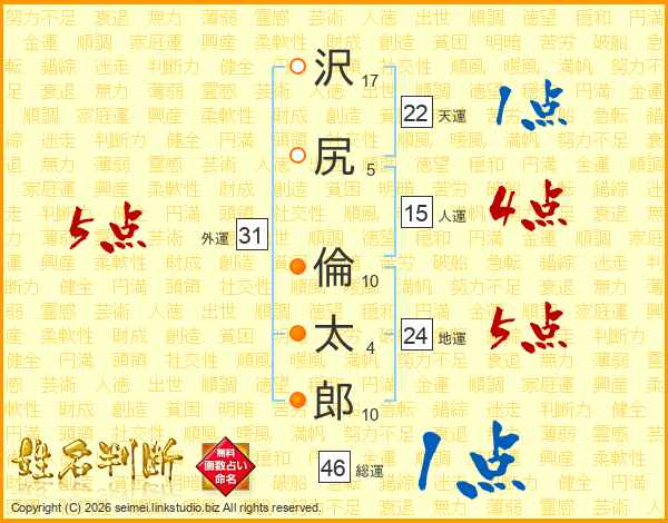 沢(17画)尻(5画) 倫(10画)太(4画)郎(10画)