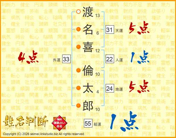 渡(13画)名(6画)喜(12画) 倫(10画)太(4画)郎(10画)