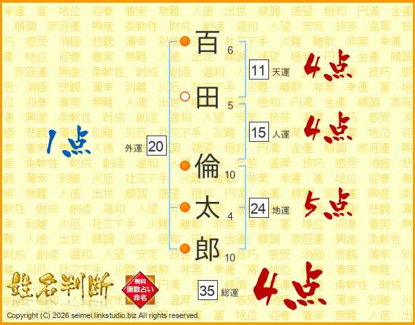 百(6画)田(5画) 倫(10画)太(4画)郎(10画)
