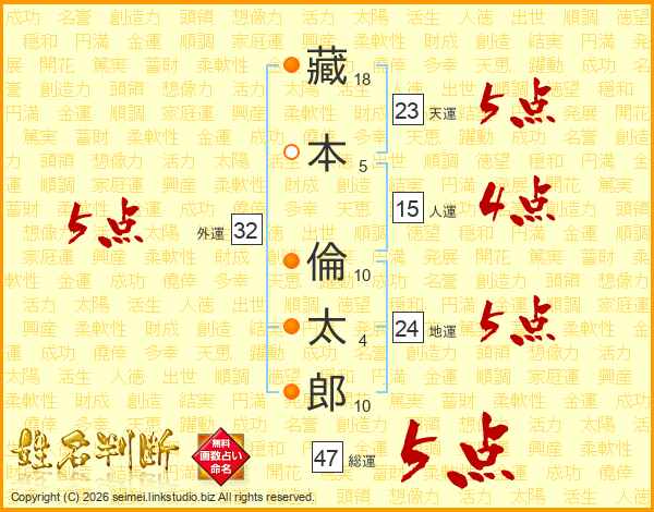 藏本倫太郎さんの総運は47画の5点!