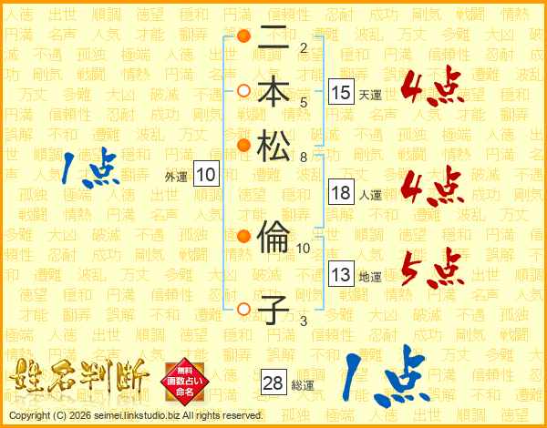 二(2画)本(5画)松(8画) 倫(10画)子(3画)
