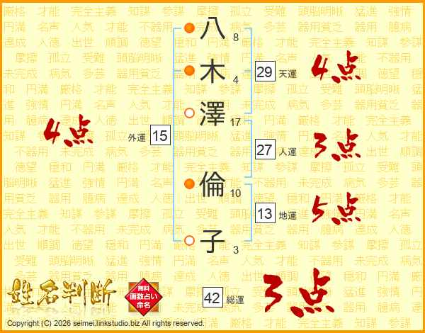 八(8画)木(4画)澤(17画) 倫(10画)子(3画)