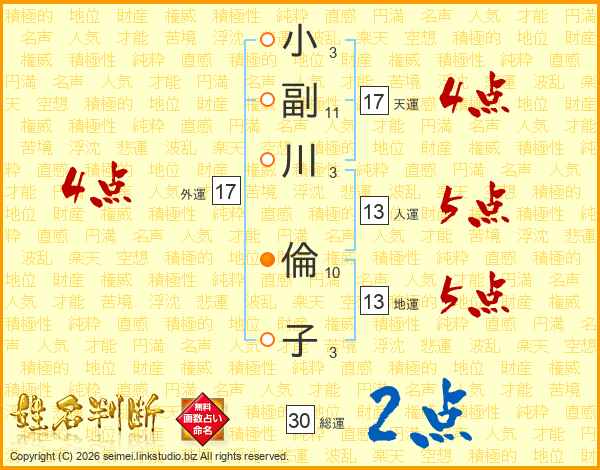 小(3画)副(11画)川(3画) 倫(10画)子(3画)