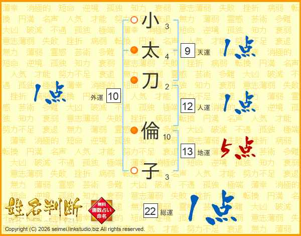 小(3画)太(4画)刀(2画) 倫(10画)子(3画)