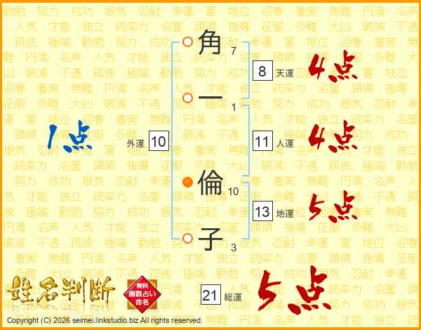 生活面を象徴する運勢です。外部から受ける影響力を表し、結婚運、家庭運や職場、環境への順応性を表します。総運から人運を引いた画数。姓や名が1文字の場合を除く。