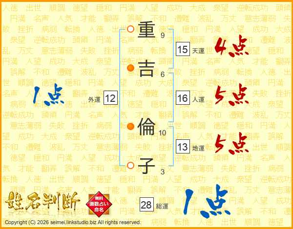 重(9画)吉(6画) 倫(10画)子(3画)