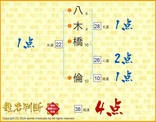八(8画)木(4画)橋(16画) 倫(10画)