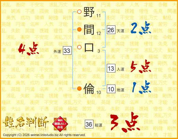 生活面を象徴する運勢です。外部から受ける影響力を表し、結婚運、家庭運や職場、環境への順応性を表します。総運から人運を引いた画数。姓や名が1文字の場合を除く。