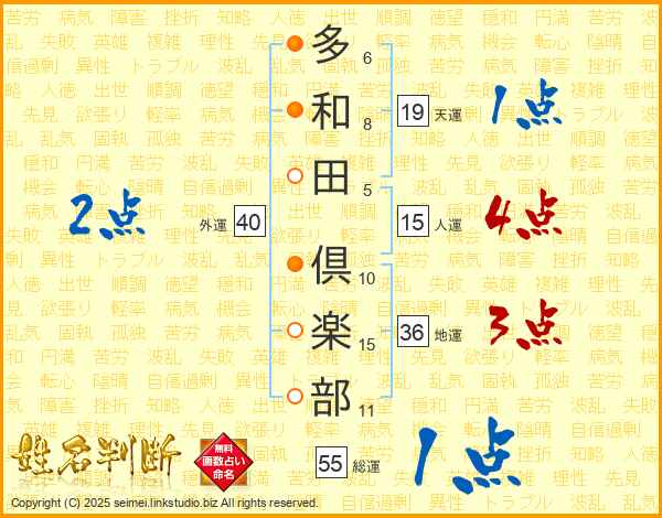 多(6画)和(8画)田(5画) 倶(10画)楽(15画)部(11画)